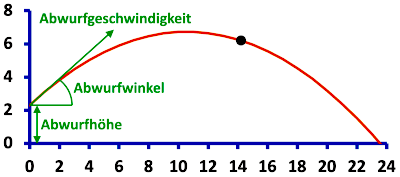 In der Abbildung ist der aktuelle Kugelstossweltrekord der Männer 23.56 m dargestellt. Wird der Luftwiderstand nicht berücksichtigt, hängt die Weite nur von der Abwurfgeschwindigkeit, dem Abwurfwinkel und der Abwurfhöhe ab. Unter diesen Annahmen führt eine Abwurfgeschwindigkeit von 14.5 m/s, ein Abwurfwinkel von 40° und eine Abwurfhöhe von 2.3 m (grosser Kugelstösser mit leicht nach oben gestreckten Arm) in etwa zum Weltrekord 2).