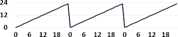 ⚠️ Das Problem ist der Sprung in der Stundenangabe (siehe unten). Für das neuronale Netz ist der Minimalwert 0 Uhr und der Maximalwert 23 etwas komplett anderes. Für uns (und in der Zeitreihe) sind 0 Uhr und 23 Uhr fast dasselbe.