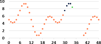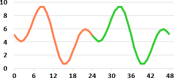 Im Folgenden betrachten wir die fiktive stündliche Zeitreihe der ominösen Messgrösse X, welche sich alle 24 Stunden wiederholt (siehe nebenstehende Abbildung). Wir nutzen ein neuronales Netz, um diese Zeitreihe zu lernen und zukünftige Werte vorherzusagen. Konkret soll das neuronale Netz mit den orangen Werten in der Abbildung trainiert werden und danach die „unbekannten“ grünen Werte möglichst genau vorhersagen.