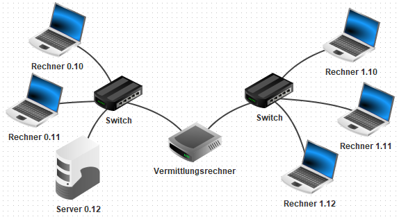 Der Router (hier Vermittlungsrechner genannt) hat zwei Netzwerkkarten. Mit zwei Netzwerkkarten können zwei verschiedene Netzwerke abgetrennt werden. Die Router-Netzwerkkarte auf der Seite an welcher der Rechner 0.10 angeschlossen ist, bekommt die IP-Adresse 192.168.0.1 und die Netzwerkkarte auf der Rechner 1.10 Seite die IP-Adresse 192.168.1.1.