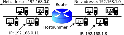 Beispiel: Ein Router trennt / verbindet die beiden Netzwerke 192.168.0.x und 192.168.1.x. D.h. im einen Netzwerk beginnen alle IP-Adressen mit 192.168.0, im anderen mit 192.168.1.