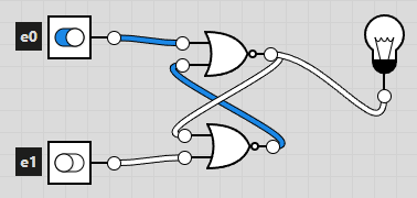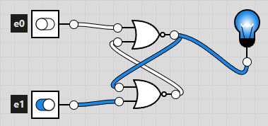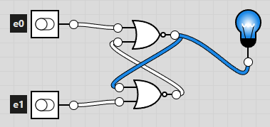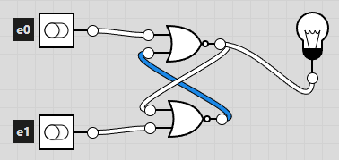 Das Flipflop ist eine Schaltung, mit der ein Bit-Zustand gespeichert werden kann. Die Schaltung besitzt zwei EingĂ€nge eâ und eâ und einem Ausgang (hier als Lampe dargestellt). Der Ausgang (die Lampe) stellt den gespeicherten Bit-Zustand dar.