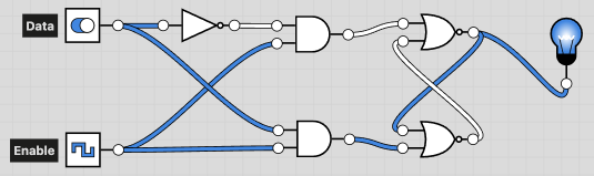 Auf diese Art kann z.B. bei einem D-Latch-Speicher (siehe Kapitel 💾 Daten speichern mit Transistoren) festgelegt werden, wann etwas in den Speicher geschrieben werden kann (siehe Abb.6). Wenn der Schalter Data von 0 (aus, weiss) auf 1 (ein, blau) gestellt wird, während die Clock 0 (weiss) ist, bleibt die Lampe zuerst auf 0 (aus). Erst wenn die Clock auf 1 (blau) wechselt, wird die 1 von Data auf die Lampe übertragen (die Lampe brennt dann 1).