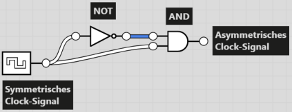 Aus einem symmetrischen Signal kann z.B. mit der Schaltung in Abb.3 ein asymmetrisches erzeugt werden. Wenn das symmetrische Clock-Signal lange genug auf 0 steht, dann liegt am oberen AND-Eingang eine 1 an und am unteren eine 0. Das asymmetrische Clock-Signal ist somit 0. Wenn das symmetrische Clock-Signal von 0 auf 1 wechselt, empfängt das AND-Gatter kurzzeitig an beiden Eingängen eine 1. Der Grund dafür ist die kleine Verzögerung des oberen Signals durch das NOT-Gatter – der obere AND-Eingang wechselt leicht verzögert von 1 auf 0.